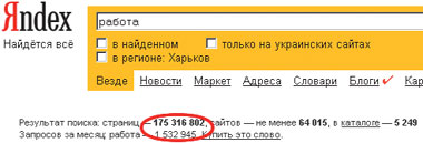 Здесь я хочу сделать одно отступление. Обратите внимание, вместе с количеством страниц здесь же, под поисковой строкой, указывается число сайтов и число запросов в месяц. Неважно, что найденных сайтов меньше, ведь даже на неспециализированных ресурсах может быть несколько веб-страниц, где ведется речь о работе, которые индексируются по этому слову. Что касается количества запросов за месяц, то они показываются для каждого слова отдельно. В случае со словом «работа» число запросов соответствует цифре из direct.yandex.ru, а, например, для фразы «ищу работу» будут показаны запросы отдельно для слов «ищу» и «работа». Причем для слова «ищу» будут учитываться все запросы, использующие его, например «ищу дом», «искать слова» и т.п., а потому эти цифры нам неинтересны.