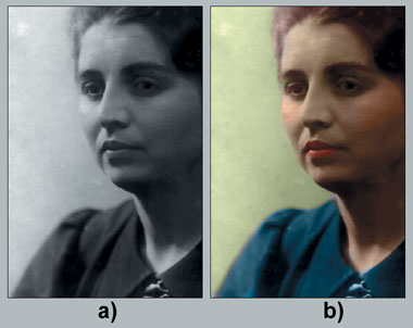 - После того как вы выбрали, какой способ вам больше по душе, пора вспомнить детство, ведь дальнейшая работа будет напоминать раскраску рисунков детских альбомов. Вы настраиваете цвет и аккуратно прокрашиваете кистью каждый отдельный цветовой участок фотографии (рис. 6). Процесс этот творческий, вам придется выступить в роли и визажиста, и стилиста, проявить фантазию при подборе цвета, чтобы восстановленная картинка приблизилась к оригиналу.