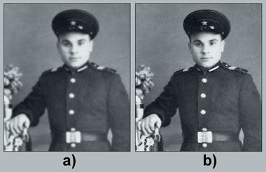 | Рис. 1. Воздействие фильтра Sharpen (Резкость): а — исходное фото; b — откорректированное фото |