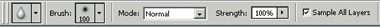 Во всех этих инструментах использован принцип кисти, а на Панели свойств есть опции, помогающие регулировать параметры инструмента (рис. 2): режим наложения Mode (Режим) и степень воздействия инструмента Strength (Интенсивность). При работе с несколькими слоями не забудьте также включить флажок Sample all layers (Образец всех слоев). Для настройки самой кисти нужно нажать на раскрывающийся список Brush (Кисть), где определить размер Master Diameter (Главный диаметр) и степень жесткости кисти Hardness (Жесткость).