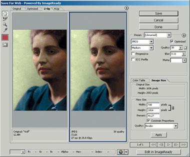 Наша исходная фотография (правда, со слоями) имеет довольно внушительные размеры — более 12 Mбайт (под каждым рисунком проставлен его размер, а под оптимизированным — еще и время загрузки). И это понятно, ведь мы сканировали и исправляли фото, добиваясь максимально высокого качества. Теперь же нужно определить оптимальный размер, но так, чтобы качество ухудшилось как можно меньше. Одним словом, следует сделать так, чтобы и волки были сыты, и овцы целы.