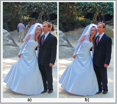 Способ 2. Клонирование. К сожалению, рассмотренный способ далеко не самый распространенный. Иногда в кадре оказывается группа посторонних людей, которых отрезать нельзя и, следовательно, нужно планомерно убирать. И здесь на помощь приходят разнообразные инструменты клонирования (см. «Мир ПК», №7/06, с.102). На рис. 2, а, например, следует оставить лишь главных участников торжества — жениха и невесту, а гостей снять, используя набор инструментов групп Clone Stamp (Штамп) и Spot Healing Brush (Плашечная восстанавливающая кисть).