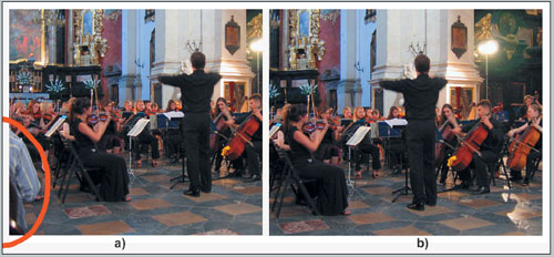 Способ 1. Кадрирование. Проще всего лишить снимок некоторых элементов, кадрируя его инструментом Crop (Обрезка). О работе с ним говорилось в «Мире ПК», №3/06, с. 128. Но этот способ применим лишь тогда, когда позволяет композиция, т.е. когда лишние объекты находятся с краю и обрезка этого края только украсит снимок. На рис. 1, а представлен именно такой вариант. В левую часть кадра попал случайный зритель. Композиция после обрезки значительно улучшилась, ведь кроме мешающей спины был убран и лишний пол (рис. 1, b).