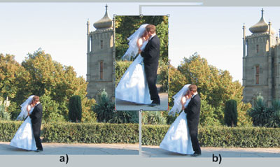 - Передвигаем парочку на то место, где они смотрятся естественнее всего, т.е. где фото меньше придется "подчищать", и ластиком стираем лишние детали, как сделали в случае с маками и собором. В результате получим изображение, представленное на рис. 7, b.