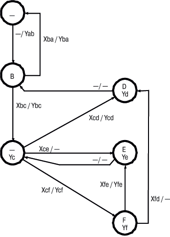 Из состояния А при входе в программу осуществляется безусловный переход в состояние В с выполнением действия Yab на переходе: