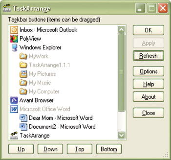 Программа TaskArrange Элиаса Фотиниса (find.pcworld.com/48986) позволяет перетаскивать все кнопки Панели задач в одно окно, где их легко упорядочить по своему желанию. Есть и альтернатива: значки можно расположить с помощью удобного управляющего окна программы TaskArrange (рис. 3). Если у вас в Windows XP активирована опция группировки сходных кнопок Панели задач (для доступа к ней надо щелкнуть правой кнопкой мыши на Панели задач и выбрать «Свойства»), TaskArrange переупорядочит задания во всплывающем меню сгруппированных поручений.
