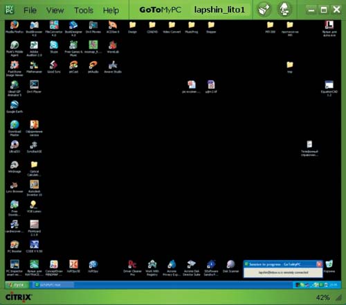 Установка программы на «серверный» компьютер прошла гладко и не заняла у меня много времени. Следует признать, что с брандмауэром вообще никаких проблем не возникло. После минутной паузы мой компьютер, которому я уготовил роль «удаленного», соединился с сервером Citrix и прошел необходимую регистрацию. После этого с любого компьютера, имеющего браузер, я мог получать доступ к своему ПК. Когда я попробовал уменьшить размеры окна удаленного компьютера на Рабочем столе «клиентской» машины, то обнаружил, что даже вдвое меньшее изображение удаленного ПК внутри окна сразу становится совершенно неразборчивым. Доходит до того, что просто делается непонятно, что же творится на удаленной машине. Получается, что наблюдать сразу за четырьмя удаленными машинами с помощью GoToMyPC Personal, мягко говоря, неудобно: если на Рабочем столе клиентского ПК одновременно расположены окна нескольких удаленных машин, то в происходящем не разобраться.