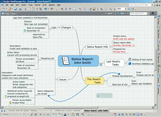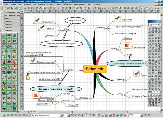 ConceptDraw MindMap (подробно см. «Мир ПК», №2/06, с. 48—51 и №7/06, с. 56—59) — мощный графический пакет, ни в коей мере не уступающий Visio по функциям конструирования диаграмм и превосходящий Inspiration по разработке интеллект-карт.
