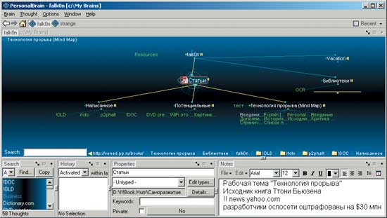 Все рассмотренные нами программы были ориентированы на анализ одной задачи/идеи/проекта. Таков смысл mind map: одна карта — один проект. Программа PersonalBrain реализует иной подход: одновременную работу сразу с несколькими проектами. Что, пожалуй, логично и востребовано, поскольку данные или решения, полученные в рамках одного проекта, могут потребоваться и в другом. Разумеется, есть шанс усложнить схему до состояния того хаоса, который гнездится в головах большинства нормальных людей. Наверное, поэтому разработчики и дали своему детищу такое название (personal brain — «личный мозг»).