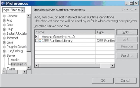 Пример того, как выглядит страница настроек Eclipse при установленных плагинах (серверных адаптерах) для Geronimo/WAS CE, приведен на рисунке.