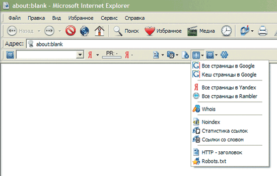 Следующее меню предлагает произвести поиск всех страниц сайта в трех системах (Google, «Яндекс», «Рамблер»), просмотреть кэш в Google, проанализировать ссылки со словами, вывести статистику ссылок, получить Whois-статус домена и подсветить noindex.