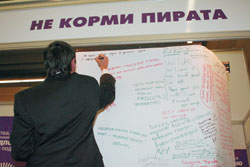 В очередной раз с успехом прошла акция «Не корми пирата». Давить диски бульдозерами стало немодно, поэтому компании перешли к наглядно-действенной агитации. Посетителям выставки предлагалось изложить в стихотворной форме и увековечить на ватмане свое отношение к использованию нелицензионного ПО. Желающих высказаться оказалось довольно много, но все они были едины во мнении: «Нет пиратству!» Самые активные борцы с нелегальным софтом ушли с выставки с подарками.