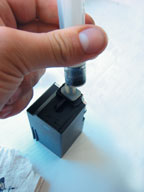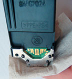 Приставив шприц с изготовленной насадкой на головку картриджа к тому месту, где находятся дюзы, начинаем откачивать чернила (рис. 5).