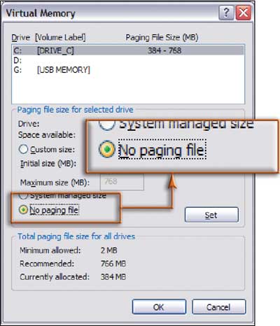 Отбросьте файл подкачки. Если объем ОЗУ компьютера составляет хотя бы 1 Гбайт, то можно ускорить работу ПК, вовсе отказавшись от использования файла подкачки, что предусмотрено в параметрах виртуальной памяти машины. Для этого просто включите функцию «Без файла подкачки» в диалоговом окне «Виртуальная память» (см. рисунок). Для входа в это окно в Windows XP щелкните правой кнопкой мыши на значке «Мой компьютер», укажите «Свойства?Дополнительно», в разделе «Быстродействие» нажмите кнопку «Параметры», после чего выберите закладку «Дополнительно» и щелкните на кнопке «Изменить».