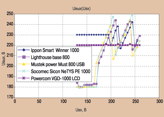 Для проверки времени автономной работы ИБП каждое из устройств полностью заряжалось, а затем к нему подсоединялся компьютер (Pentium 4-3200, 256-Mбайт GeForce 7800, 1-Гбайт память типа DDR, 120-Гбайт жесткий диск) и 17-дюймовый ЭЛТ-монитор. Внешнее питание отключалось, после чего устанавливалось время автономной работы. Затем снимался график зависимости входного напряжения от выходного. Регулировка осуществлялась с помощью лабораторного автотрансформатора, напряжения измерялись цифровыми мультиметрами. Для каждого из устройств определялись точки переключения, при которых происходит переход в автономный режим питания (понижение напряжения в сети) и переход на питание от сети (повышение напряжения). Также мы стремились выявить дополнительные особенности всех моделей.