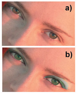 После того как вы обозначили светлые и темные участки, нанесите цветные тени инструментом Replace Color (Замена цвета). При выборе цветов отдавайте предпочтение приглушенным тонам, иначе макияж будет смотреться чересчур ярко и неестественно. Грамотно подобрать цвета и тона, чтобы они исправляли недостатки, подчеркивали достоинства и привлекали внимание, — настоящее искусство. Поэтому нелишним будет пролистать журналы, возможно, именно там вы подыщете идею для макияжа.