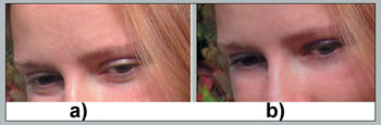 1. Круги под глазами убираем инструментом Blur (Размытие). Установите параметр Straight (Сила) равным 100% и проведите несколько раз по портящим впечатление кругам. Результат налицо (рис. 5, b). Иногда мешки под глазами бывают слишком объемными, чтобы стирать их инструментом Blur (Размытие), не снижая качества фотоснимка. Тогда на помощь приходят инструменты Spot Healing Brush (Плашечная восстанавливающая кисть) и Healing Brush (Восстанавливающая кисть), описанные в «Мире ПК», №8/06, с. 102.