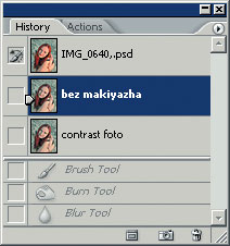 History Brush (Кисть истории), расположенный на панели Tools (Инструменты). Он поможет стереть все изменения, произведенные в определенном месте, и вернуться к исходному снимку. Исключительно ценно, что, как и для любой другой кисти, для History Brush доступны все свойства данного инструмента. Благодаря этому можно легко экспериментировать с прозрачностью, жесткостью и режимами наложения.