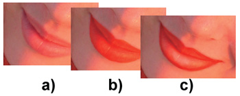 - Потом воспользуйтесь командой Variations (Варианты) меню Image (Adjustments (Изображение (Коррекция) и поэкспериментируйте с разными тонами помады. Команда Variations (Варианты) дает, пожалуй, наиболее наглядные результаты. Перед вашими глазами будет сразу несколько вариантов, из которых легко выбрать понравившийся. После того как цвет определен, можно сделать его светлее или темнее, используя значения Lighter или Darker соответственно (рис. 3, b).