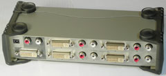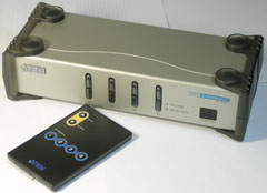 В отличие от описанных нами ранее КВМ-переключателей устройство ATEN не имеет гнезд PS/2 или USB, по которым возможна передача питающего напряжения, поэтому оно снабжено внешним блоком питания. Переключатель имеет на передней панели окошко с ИК-датчиком для ПДУ, а также четыре индикационные группы, совмещенные с кнопками, — по количеству входов. В каждой группе предусмотрено отображение светодиодами разного цвета наличия сигнала на данном входе и выбора входа для передачи сигнала на выход. Устройством можно управлять как с помощью входящего в комплект ПДУ, так и кнопками на передней панели. Максимальное поддерживаемое разрешение составляет 1600х1200 пикселов. Впрочем, это уже ограничение интерфейса DVI.
