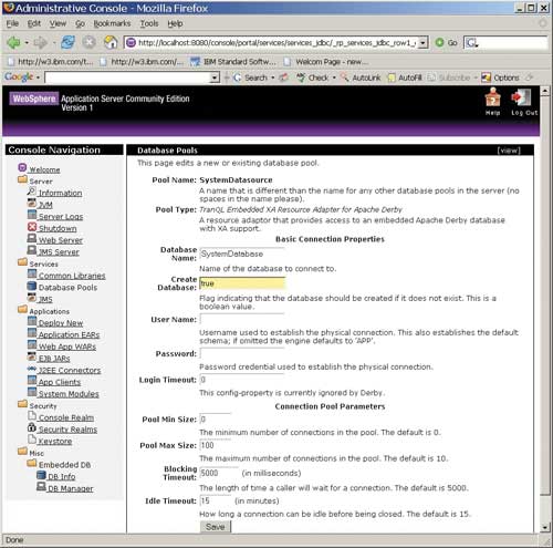 Поскольку СУБД Derby интегрирована в состав WAS CE, использовать ее проще, чем другие СУБД, — в частности, за счет того, что в состав консоли администратора WAS CE входит менеджер управления БД Derby.