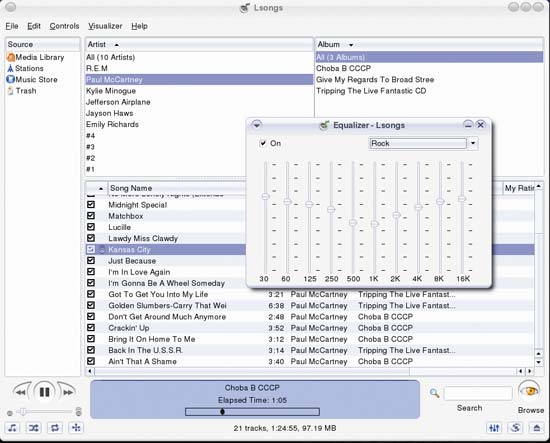 Интерфейс плеера похож на таковой у iTunes. В нижней части окна расположена основная информационная панель, где отображается контекстно зависимая информация. При воспроизведении это стандартные данные из тегов, а также полоска таймера. Когда плеер импортирует записи, в этом месте можно следить за ходом обработки файлов. Три кнопки в правом нижнем углу отвечают за эквалайзер, визуальные эффекты и выброс лотка CD соответственно. Интересно, что предустановки эквалайзера здесь отличаются от таковых в AmaroK. Нужно признаться, что в Lsongs эквалайзер работает гораздо лучше, чем в AmaroK, и его не хочется «сразу отключить». Еще Lsongs отличается от всех других плееров хорошей интеграцией с интернет-радио и магазином MP3-tunes, а также доработанной поддержкой сюемных устройств – плееров Creative Nomad, Dell Digital Jukebox и конечно же Apple iPod. Кроме чисто технических моментов стоит отметить великолепный дизайн интерфейса. Речь идет именно о хорошем проектировании, а не о «красивостях». При уменьшении размеров окна в нем по-прежнему отлично умещаются и контекстный браузер, и зона поиска композиций, и сам плей-лист. Интересна и «Корзина» – при удалении песен прямо из окна плеера файлы не исчезают, а стираются только при опустошении «Корзины». Эта мелочь роднит Lsongs с файловым менеджером и делает его неотюемлемой частью операционной системы. Недостатком плеера можно считать невысокую скорость загрузки (целых три секунды!) и небольшие рывки при смене песен. Впрочем, последнее можно исправить, обновив библиотеку libxine до последней версии.