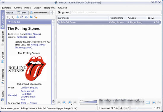 В нижней части окна программы расположены кнопки управления воспроизведением, а также ползунок громкости. Запустив проигрывание, вы можете смело закрыть окно AmaroK – музыка будет продолжать играть, а в системном лотке возникнет маленький значок программы. Щелчок по нему снова откроет основное окно. Внимательно рассмотрев интерфейс плеера, вы заметите набор вертикальных вкладок вдоль левой границы окна. Наиболее полезными из них являются верхние вкладки – «Статистика» и «Коллекция». Первая отображает максимально подробную информацию о текущей композиции, включая присвоенный ей вами рейтинг, обложку альбома и разнообразные статистические данные. Кстати, загрузить обложки для альбомов можно, подключившись к Интернету и воспользовавшись мастером обложек («Инструменты Б?? Управление обложками»). Наличие доступа к Всемирной паутине заметно повышает полезность AmaroK: благодаря интеграции плеера с Wikipedia и другими веб-службами вы можете не только прочитать текст песни, но и ознакомиться с настоящей энциклопедической статьей об исполнителе прямо в окне программы!