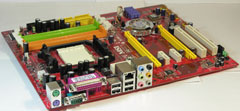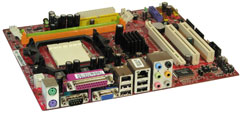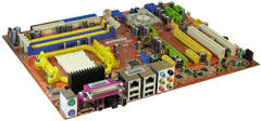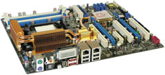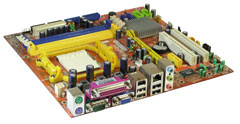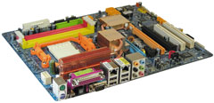 Крохотная плата размерами меньше обычной microATX — всего 24,4Ё20,5 см. Из явных минусов — наличие только двух разъемов для модулей памяти и, следовательно, ограничение ее максимального объема 2 Гбайт. Дисковых накопителей также можно подключить только по два каждого вида: Serial ATA и IDE. В остальном же изделие достаточно хорошо укомплектовано периферией: IEEE 1394, восьмиканальный звук, встроенный видеоконтроллер. Видимо, эта модель рассчитана на то, чтобы вообще обходиться без плат расширения, хотя возможность подключения последних, разумеется, есть.