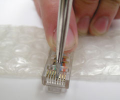 Теперь самое сложное — «разделка» кабеля и монтаж разъемов. Если вы не собираетесь протаскивать кабель через отверстия в стене, лучше попросите запрессовать разъемы в магазине — там наверняка найдутся и соответствующий инструмент, и человек, готовый оказать посильную помощь за соответствующее вознаграждение. Когда же такой вариант неприемлем, то острым ножом снимите кусок изоляции и освободите так называемую витую пару. Проденьте провода в соответствующие отверстия разъема и обожмите контакты обыкновенной отверткой. Будьте внимательны — каждый провод окрашен в определенный цвет, и это не случайно. Цветовая маркировка и последовательность действий показаны на рисунках.