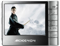 Взяв в руки этот плеер, сразу обращаешь внимание на то, что корпус у него металлический, — весьма кстати, так как в путешествиях он может подвергнуться различным ударным воздействиям. Кроме того, модель снабжена хорошим защитным чехлом. Все узлы управления расположены на правой стороне корпуса возле экрана, что позволяет манипулировать ими одной рукой. На торце устройства имеется встроенный динамик — увы, звучит он негромко и с большими помехами. Поэтому для прослушивания аудиозаписей лучше использовать наушники. Качество звучания у них неплохое, к тому же на проводе имеется регулятор громкости. Жидкокристаллический дисплей оставляет желать лучшего: изображение зернистое, движущиеся объекты сильно размываются, что особенно заметно при просмотре фильмов с динамичными сценами. Уровней регулировки яркости всего три, причем даже самый высокий недостаточен для комфортного просмотра видео. К сожалению, отсутствует разъем для карт памяти и функция USB-Host, так что если вы фотографируете на цифровую камеру, то при заполнении памяти использовать Archos 404 в качестве накопителя без обращения к компьютеру вам не удастся. В комплект поставки входит специальная стойка для установки плеера в вертикальное положение.