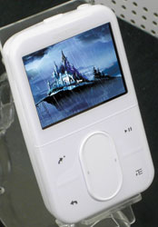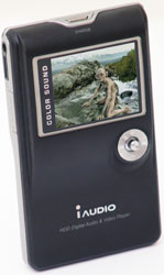 Эта модель также имеет приятный дизайн. Все элементы управления размещены на правой стороне корпуса, что позволяет работать с плеером одной рукой. Корпус оформлен в белом и сером цвете. Меню сделано в виде пиктограмм, а навигация осуществляется с помощью пятипозиционного джойстика, что довольно удобно. Полезной функцией этого устройства является возможность запоминания позиции при воспроизведении файла — можно продолжить смотреть фильм с того момента, на котором вы прервались и выключили плеер. К тому же на дисплее отображается вся необходимая информация о проигрываемых файлах. Качество экрана оказалось на среднем уровне: пикселизированности практически не видно, но четкость изображения значительно ниже, чем у конкурентов. Сказывается и поддержка всего лишь 16 тыс. цветов — цветовые переходы не плавные, а ступенчатые, что особенно заметно в фильмах. Кроме того, параметры изображения нельзя менять «на лету», во время просмотра кино, — приходится копаться в меню. Для загрузки файлов на жесткий диск не требуется установка драйверов — плеер определяется компьютером как внешний носитель информации. В верхней части корпуса по бокам расположены два стереодинамика, которые выдают довольно качественное звучание, правда, на большой громкости заметны нелинейные искажения (все же рекомендуется использовать наушники или другую акустическую систему). Все интерфейсы расположены на левом торце, и часть из них снабжена защитной крышкой.