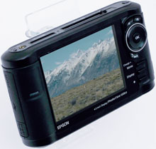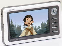 Этот плеер — самый выдающийся в обзоре, причем не только по функциональной начинке, но и по габаритам: корпус явно рассчитан на большую мужскую кисть. Масса устройства весьма значительна, так что для удерживания его на весу, например, в течение всего фильма надо иметь неплохо развитую мускулатуру. Основное его предназначение — вывод фотографий, впрочем, и с видео оно справляется не хуже. По характеристикам экрана плеер является лучшим среди представленных: размер оптимален, пикселы практически незаметны, хорошая цветопередача, высокие яркость и контрастность — именно то, что необходимо любителю мобильного видео. Меню проработано очень неплохо, хотя навигация по файлам все же не столь удобна, как хотелось бы, но со временем привыкнуть можно. Меню загружается очень быстро — с момента включения проходит не более 5 с. Имеется встроенный довольно качественный динамик, но поскольку он находится в задней части устройства, звук получается чуть приглушенным. В отличие от соперников Epson P-5000 снабжен считывателем карт памяти, поддерживающим форматы SecureDigital и CompactFlash. Предусмотрена и функция подключения внешних устройств, причем разъем имеет стандартные размеры. Все без исключения интерфейсы закрываются пылезащитными крышками. Аккумулятор можно легко заменить. В комплекте имеется чехол и ремешок для ношения плеера на кисти.
