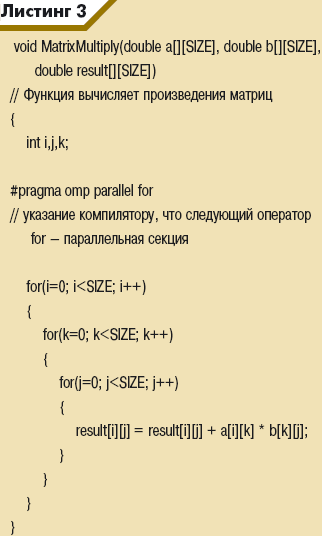 Директива #pragma omp parallel for указывает, что это инструкция OpenMP, задающая параллельную секцию, а именно параллельный оператор for. Итак, программа для многоядерной системы готова. Просто, не правда ли? Когда выполнение программы дойдет до данного места, то создадутся дополнительные потоки. Это справедливо для многоядерной системы, а на компьютере с одним процессором программа будет выполняться в один поток, так же как и прежде. Теоретически быстродействие на данном участке должно возрасти вдвое для двухъядерного процессора, однако на практике такой прирост недостижим из-за различных факторов, в частности из-за издержек на порождение потоков и повышенной нагрузки на шину памяти. Кроме того, нужно учитывать, что мы оптимизировали только один цикл во всей программе, поэтому можно говорить о приросте быстродействия всего приложения только тогда, когда оценивается доля времени работы этого цикла в общем времени выполнения.
