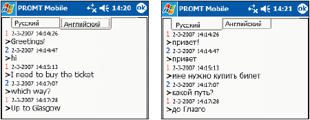 «Синхронный» перевод столь же прост, как описанные выше способы работы. После запуска диалогового переводчика, который реализован как самостоятельная программа, нужно задать направление перевода и определить тему разговора (кстати, по ходу беседы ее можно изменять). Далее в окне строки ввода набивается на клавиатуре нужный текст и запускается перевод на язык вашего собеседника (в нашем случае это английский). Как только он завершится, PROMT Mobile предоставит собеседнику возможность ввести ответ. Когда он закончит набор текста, то вы опять должны нажать кнопку, инициирующую процедуру перевода. После выполнения работы программа автоматически переключается на русскоязычное диалоговое окно и показывает в нем переведенный текст. Таким образом, последовательно обмениваясь фразами, вы и ваш собеседник сможете следить за ходом разговора каждый на своем языке в диалоговом окне переводчика. Если понадобится, например, вспомнить, о чем ранее шла речь, имеется возможность просмотра более ранних реплик. Переключить диалоговое окно на нужный язык можно и вручную. Перевод разговора дозволяется сохранить в отдельном файле.