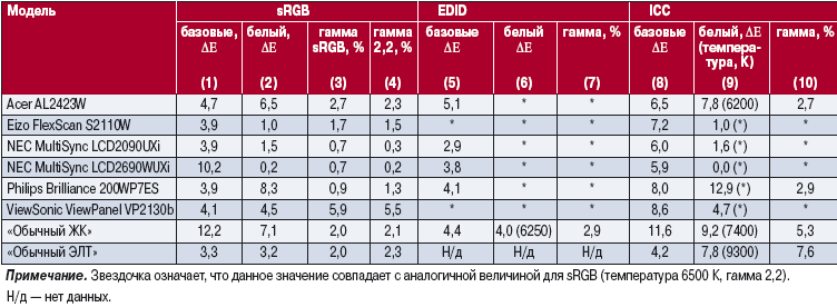 В столбцах 2, 6, 9 приведено отклонение белого. Большинство мониторов в EDID содержит цветовые координаты абсолютно черного тела с температурой 6500 К, поэтому результат повторяет полученный для sRGB. Цветовой профиль мог заявлять совсем иную температуру, нежели EDID, — это значение приведено в скобках.