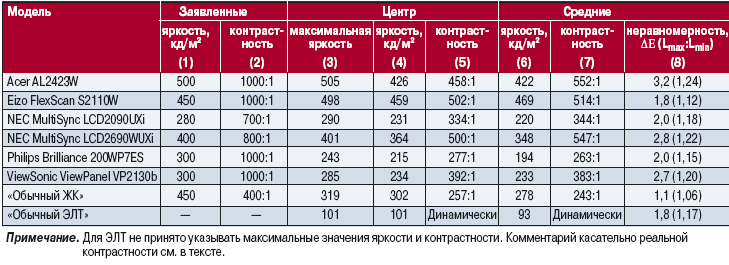 Одновременно подтвердилось, что почти все модели действительно могут обеспечить указанную в их спецификации яркость, но лишь в течение первых минут работы, после чего следует проседание. Приятным исключением из этого правила стала модель Eizo: установившаяся за 2 ч работы яркость превышала номинал на 2—4%, а пиковая — и вовсе на 11%. Два монитора, ViewSonic VP2130 и «обычный ЖК», наоборот, выдавали на 20—30% меньше положенного.