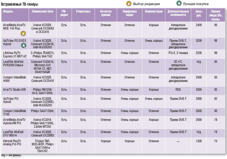 Тем не менее появившиеся за прошедший год модели действительно хороши. Выбор был трудным, но все-таки наиболее интересной из рассмотренных нами показалась GoTView PCI DVD3 Hybrid — она и получила значок «Выбор редакции». «Лучшей покупкой» мы решили назвать ТВ-тюнер AVerMedia AVerTV MCE 116 Plus за наиболее удачное соотношение аппаратной начинки и запрашиваемой цены.