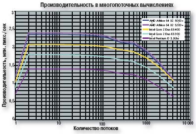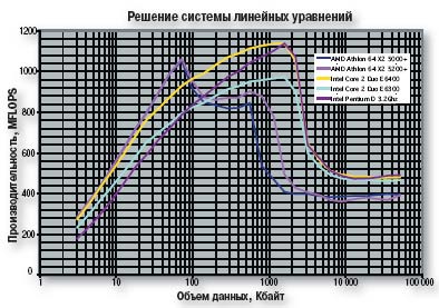 В области «чистых» вычислений, т.е. там, где количество данных невелико — умещается в кэш-память первого уровня, а алгоритмы обработки ресурсоемки, безусловными лидерами выступают процессоры AMD. Впрочем, они и по частоте заметно превосходят фигурирующие в тестах Core 2 Duo. Ну, о неоптимальности архитектуры Pentuim D для вычислений мы уже упоминали, поэтому то, что он оказался аутсайдером, неудивительно. К «вычислительным» относится и наш тест на многопоточность. А вот при решении системы уравнений приходится с помощью простых арифметических операций перелопачивать большие объемы данных, поэтому в нем существенно возрастает роль кэш-памяти. В последнем примере (решение системы линейных уравнений) прекрасно видно, что при небольших объемах данных лидируют процессоры AMD, постепенно, по мере увеличения объема данных, отдавая пальму первенства кристаллам Intel, обладающим более быстрой кэш-памятью.