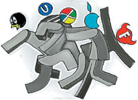 Мало кто задумывается о том, что корпорация Microsoft не вечна. Использовав IBM в качестве трамплина для мирового господства в сфере программной инфраструктуры ПК [2], она вышла из тени Голубого гиганта и стремительно захватила контроль над системным и офисным ПО для ПК. С мая 1990 г., когда Microsoft выпуском Windows 3.0 нанесла разящий удар в спину IBM, она за три года привела Голубого гиганта к краю пропасти, и IBM — гордость американской экономики — от краха спасло лишь чудо. «Высшее руководство IBM, — писал впоследствии Луис Герстнер (глава IBM в 1993—2002 гг.), — было одержимо идеей исправить ошибку 1980-х гг. и отобрать контроль над операционными системами у Microsoft (и, в меньшей степени, желанием лишить Intel контроля в сфере производства микропроцессоров)... В лучших традициях IBM мы собирались драться до конца». Итог противостояния известен. «Матч-реванш» IBM проиграла. Империя Microsoft вот уже почти два десятилетия занимает гос-подствующие высоты, и, как многим представляется, ничто не может поколебать ее сегодняшнее положение. Но все же такой момент может наступить, причем гораздо раньше, чем того ожидают. Билл Гейтс, который отлично знает всю кухню прихода к мировому господству, понимает это, как никто другой: «Microsoft не застрахована от провалов, и мне нужны те, кто доказал, что не теряется в самых неординарных обстоятельствах. Конец для лидера может наступить очень быстро».