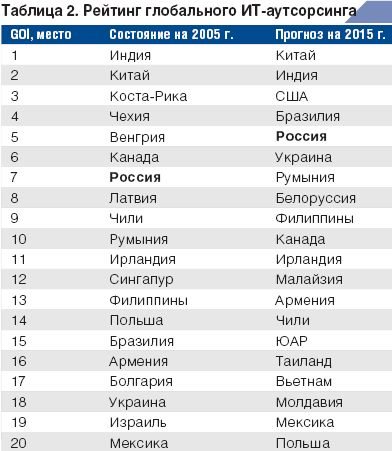 В соответствии с отчетом Global Outsourcing Report, три четверти компаний в США для ведения хотя бы части ИТ-бизнеса прибегают к услугам сторонних компаний (к аутсорсингу, причем за границами своей страны). По оценкам аналитиков Horasis в отношении глобального ИТ-аутсорсинга, в рейтинг-листе GOI (Global Outsourcing Index) Россия в ближайшие десять лет войдет в пятерку ведущих стран мира (табл. 2).