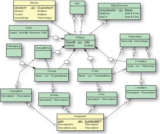 Объектная модель. Используется схема обобщения (наследования) с общим для всех абстрактным предком (суперклассом) Object. Любой класс в системе является прямым или дальним потомком (подклассом) класса Object. Множественное наследование не поддерживается. По умолчанию используется схема отображения 2 (см. врезку 2) «класс — таблица», т.е. каждый класс отображается на новую таблицу, а связь 1:1 с таблицей суперкласса (предка) осуществляется по ключу-идентификатору ObjectID; атрибуты суперкласса не переносятся в подкласс, за исключением ключа. На самом деле метод отображения на таблицы на данном этапе не так важен, поскольку снаружи классы будут видны только как проекции.