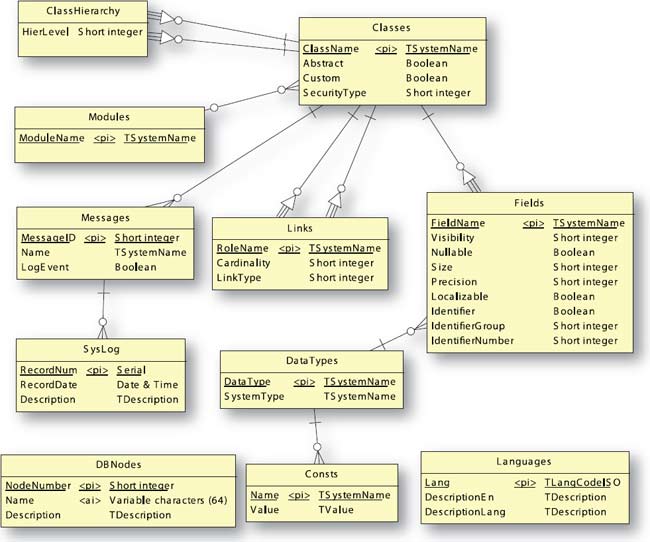 Метаданные. Поддерживается структурное описание классов объектов и связей между ними. Метаданные служат для автоматической генерации таблиц, проекций и триггеров/хранимых процедур, реализующих механизмы описанной выше объектной модели.