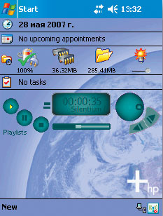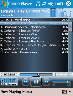 А вот это, пожалуй, один из популярнейших проигрывателей под Windows Mobile 2003. Он воспроизводит все возможные звуковые файлы. Ценной особенностью является то, что основной интерфейс программы включает в себя не только кнопки управления, индикаторы с информацией о проигрываемом файле да лист проигрывания, а даже эквалайзер и графический анализатор спектра. Те же клавиши управления очень удобно располагаются на экране, довольно крупные, что весьма кстати для людей, привыкших управлять своим КПК, используя только стилус. Что касается листа воспроизведения, то его организация продумана в программе для любых случаев. Во-первых, Pocket Player может открывать листы воспроизведения, созданные в других программах и выглядящие как файлы с расширениями m3u, pls, asx, plt и lst. Во-вторых, этот проигрыватель может автоматически загружать (или выгружать) композиции, содержащиеся на карте памяти, при ее установке в КПК (или извлечении из него). В-третьих, все действия над списком проигрывания (такие, как добавление, удаление и пересортировка) можно производить прямо из основного интерфейса, не открывая специального окна организации листа. А сейчас перейдем к звуку. Как уже было сказано, эквалайзер, вернее его миниатюрное изображение, находится на главном интерфейсе, но нажатие на него приводит к многократному увеличению, достаточному для комфортной работы. Предварительно установленные регулировки можно сохранять и впоследствии загружать. Также в опциях есть набор спецэффектов (эхо, хор, окружение). Этот набор можно расширять установкой дополнительных библиотек в каталог с программой. Громкость проигрыватель выдает очень хорошую, на 5 и даже 10% выше, чем многие другие аналогичные программы. Качество звука радует слух точно не меньше, чем у остальных МР3-проигрывателей, да и возможность слушать музыку из Интернета явно не лишняя для такого плеера. Ну и последнее относительно стандартных функций. В настройках можно зарезервировать различные действия проигрывателя Pocket Player за любыми клавишами на вашем КПК. Также предусмотрены свои таймеры выключения дисплея и сна (к сожалению, sleep timer устанавливается только на полчаса), а с помощью специального модуля можно интегрировать интерфейс проигрывателя в панель Today. В любом случае при сворачивании окна на панели задач остается пиктограмма, с помощью которой можно управлять воспроизведением. Демонстрационная версия работает ровно 30 дней с момента первого запуска. При работе программа занимает около 1,5 Мбайт оперативной памяти.