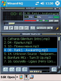 По сравнению с ПК-версией карманный вариант не столь любим и распространен. WinamPAQ совместим с программой Winamp 2.0, т.е. может использовать «шкурки» и даже некоторые модули, предназначенные для настольного ПК. Проигрывает МР3- и OGG-файлы. Как и у «Большого Брата», здесь есть возможность создавать, сохранять и редактировать списки воспроизведения, причем управление списком воспроизведения абсолютно идентично таковому в программе Winamp. Интерфейс классически состоит из трех блоков (основной с органами управления, эквалайзер и плей-лист), каждый из которых можно перемещать, сворачивать и закрывать. Присутствует возможность увеличения или уменьшения интерфейса (scale), что вкупе с такой функцией, как Always on top (всегда поверх всех приложений), может сделать работу на КПК весьма и весьма комфортной. Когда программа не свернута, ею можно управлять с помощью курсора и клавиш на корпусе КПК, т.е. одной рукой.