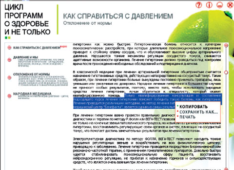 Лишь однажды контент диска заставил поморщиться: в один из разделов «ненароком» просочилась реклама. А как иначе воспринимать такие пассажи: «…лечение проводится различными методами, но метод лечения гипертонии, который предлагает медицинский центр «Бенефакта», является одним из самых результативных» или «методы, используемые при лечении гипертонии в медицинском центре «Бенефакта», помогут справиться с болезнью»? Общего впечатления это не портит, но досаду вызывает, как нелепая фальшивая нота. Впрочем, это, пожалуй, единственная претензия к диску.