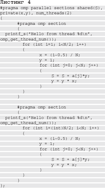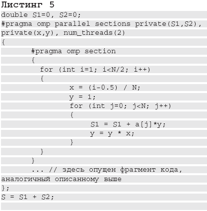 В нашем примере мы создаем две секции кода, которые взаимодействуют посредством сохранения вычисленных значений в общей переменной S. Можно воспользоваться и другим подходом для вычисления суммы. Скажем, объявить еще две переменные S1 и S2, присвоить им нулевые значения до объявления параллельных секций, затем в каждой секции вычислить свою сумму элементов S1 или S2. Таким образом, переменные S1 и S2 будут содержать «полусуммы», после чего результат S можно будет найти как их сумму. Фрагмент кода, реализующий данную идею, приведен в листинге 5.
