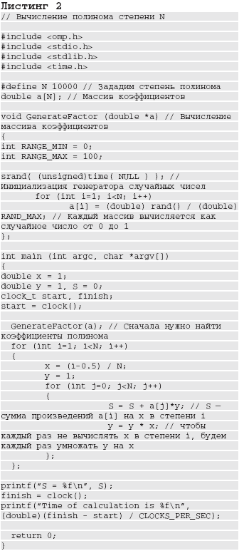 Вычисление полинома высоких степеней — задача простая, но требующая значительных вычислительных ресурсов. Следует обратить внимание на то, что прог-раммный код в данном случае уже оптимизирован: так, если сумму произведений S вычислять по формуле S = S + a [j] * pow (x, j), где функция pow () возводит аргумент x в степень j на каждом шаге цикла, то падение производительности будет иметь просто катастрофический характер. Поэтому следующий шаг к сокращению времени работы программы — распределение вычислений между всеми доступными процессорами.