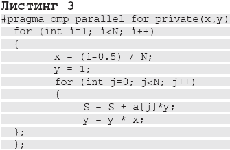 Рассмотрим код более подробно. Здесь вычислительная нагрузка сосредоточена внутри цикла. Самый простой способ распараллелить цикл — добавить прагму #pragma omp parallel for, как это сделано в листинге 3.