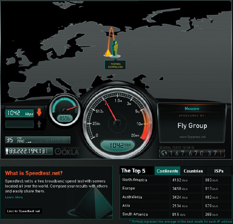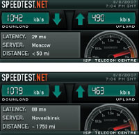 Для любителей более конкретных сведений приводим на снимках экрана два скоростных результата испытаний сервиса Speedtest. net — загрузки/выгрузки данных через Москву и Новосибирск для нашего подключения в сети WiMAX. Сами видите — скорость загрузки демоигры World in Conflict с сайта разработчиков посредством браузера Internet Explorer составила 960 кбит/с, что лишь немного меньше показателей синтетических испытаний.