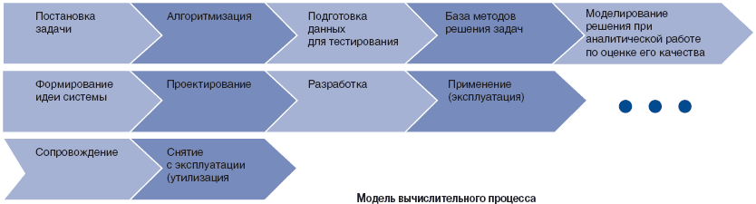 Что же добавляет в процессное описание системы ПИ? Во-первых, при постановке задачи для системы ПИ связь с основной системой сохраняется на протяжении всего ЖЦ и управление им определяется ЖЦ основной системы. Алгоритмизация задачи выстраивается так, что зависит от управления вычислительным процессом. Появляется специфика в подготовке данных для тестирования на всех этапах ЖЦ, они должны учитывать особенность используемых вычислительных методов. Неизбежно возникающие в вычислительном процессе обратные связи приводят к тому, что процессная модель системы ПИ уже не может быть каскадной или последовательной. В модели на конечном этапе вычислительного процесса необходимо предусматривать возможность оценки качества решения, т. е. выполнения аналитической работы, которая требует от пользователя высокой квалификации и специфической программно-аппаратной поддержки.